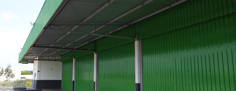 Este projeto apresenta um telhado de duas águas com painéis na cor da logo do cliente, criando uma identidade visual marcante. As marquises ao redor do pavilhão principal cobrem as docas de carregamento, também utilizando painéis que reforçam a identidade da obra.
