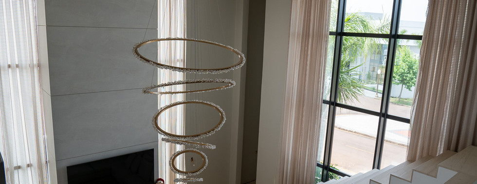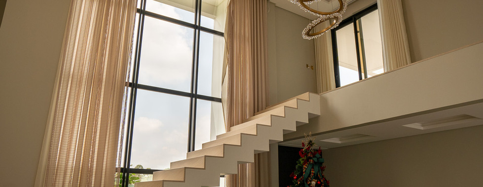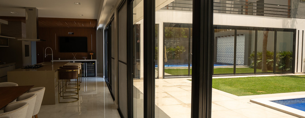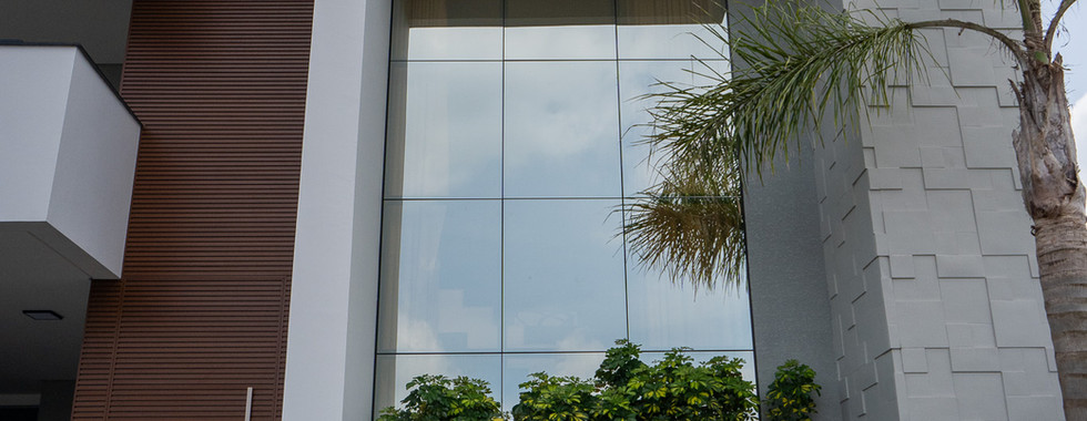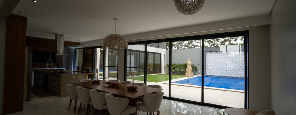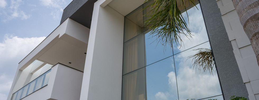 A residência conta com uma Fachada Glazing, elementos ripados de alumínio na cor amadeirado e vidros refletivos champanhe, que oferecem uma combinação perfeita de elegância, proteção e eficiência solar. No salão de festas, a janela de correr com seis folhas sequenciais permite uma abertura quase completa, integrando harmoniosamente o espaço interno com a área da piscina.